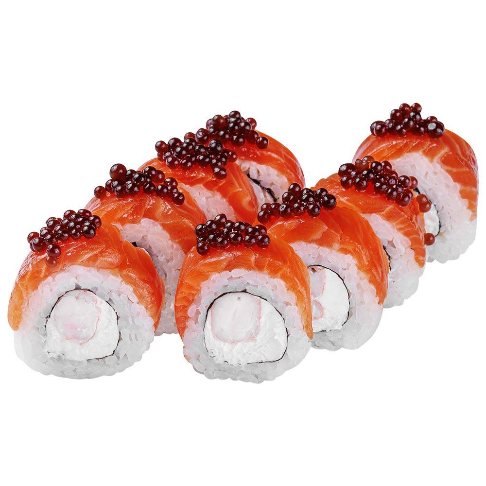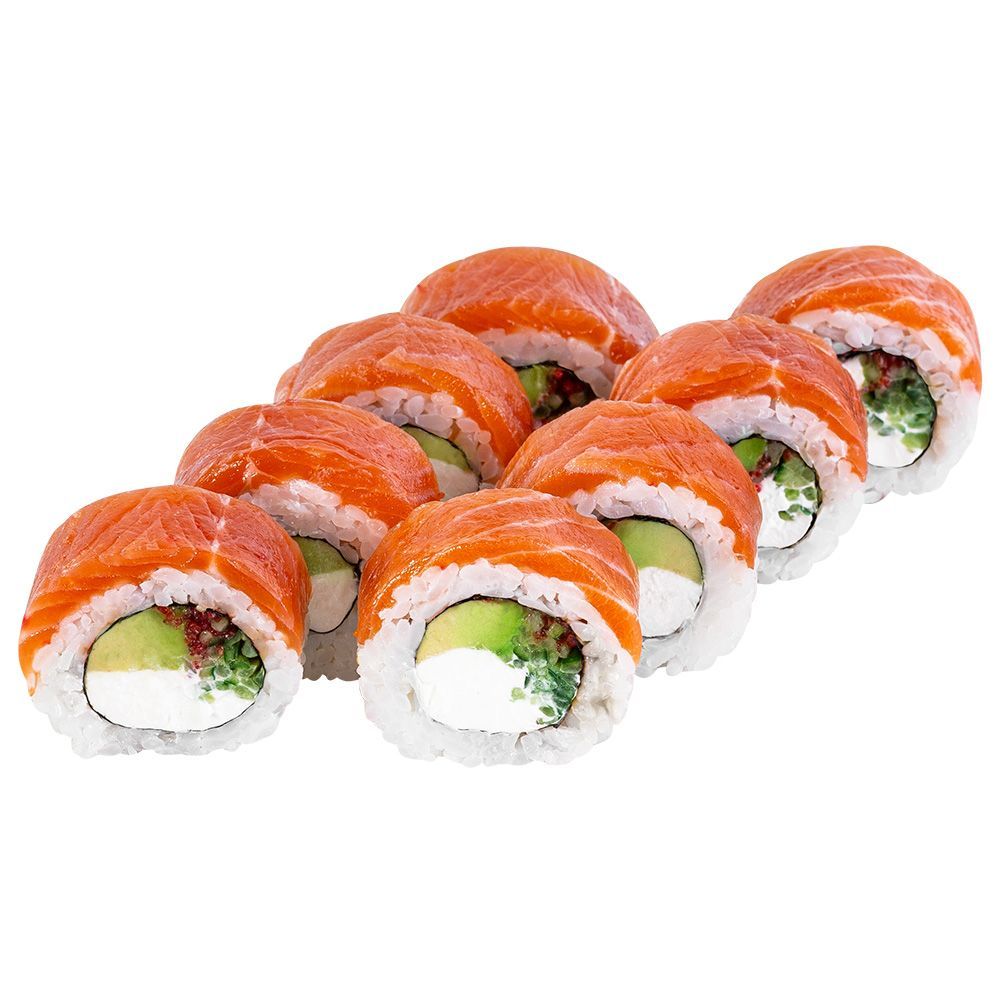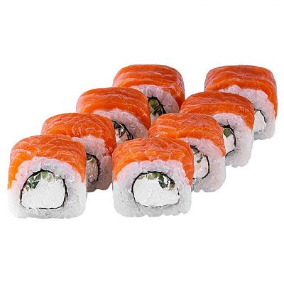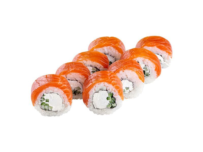 Лосось, сыр Филадельфия, огурец, рис, нори. Вес блюда может отличаться +/- 20 г. Входит: имбирь, васаби и соевый соус.