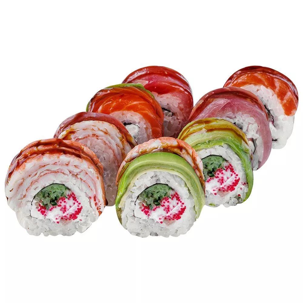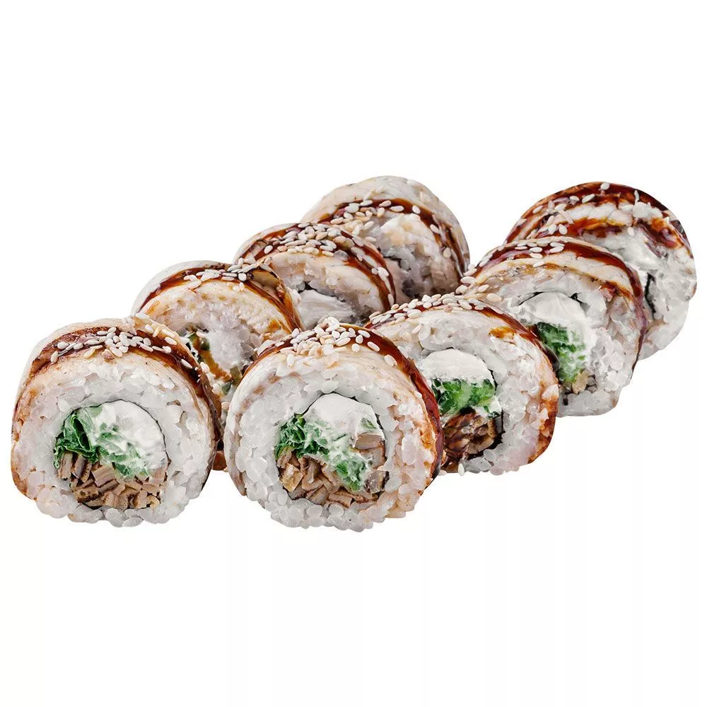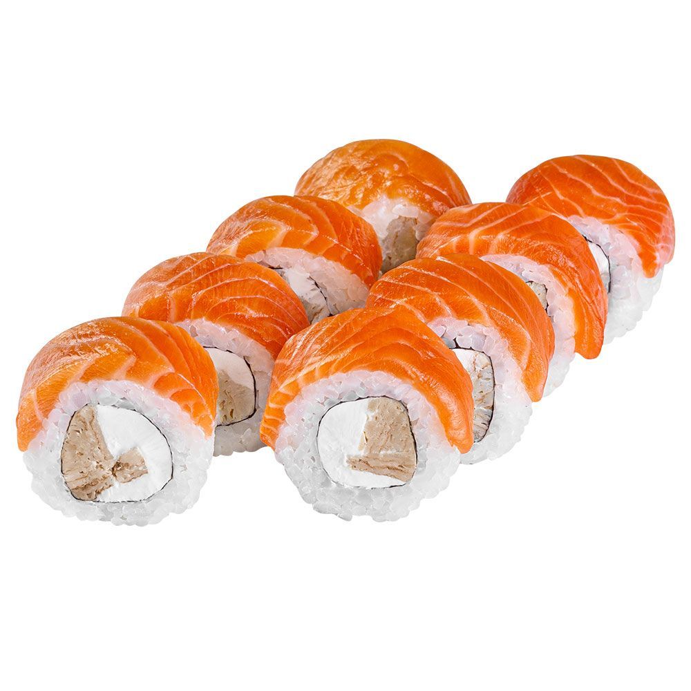 Угорь, лосось, сыр сливочный, огурец, соус Унаги, кунжут, рис, нори, лук зеленый. Вес блюда может отличаться +/- 20