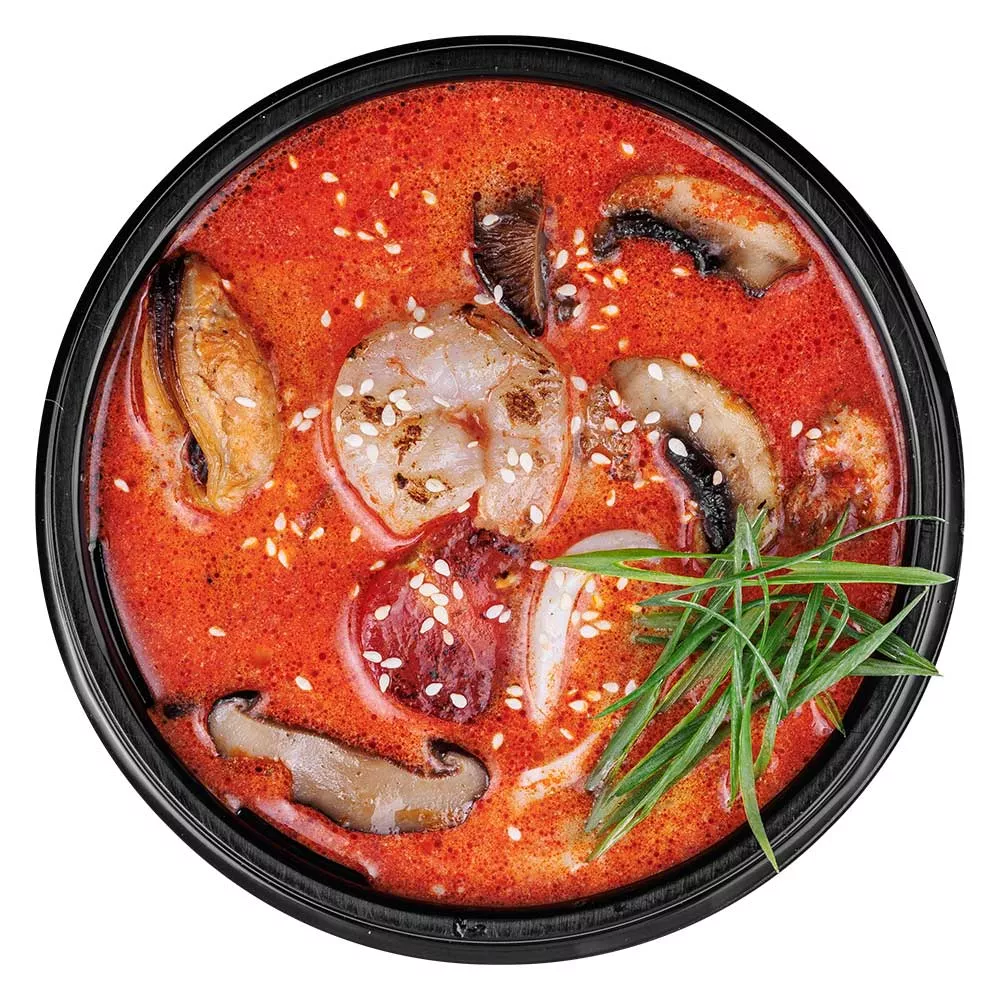 Куриное филе, бульон Том Ям, кокосовое молоко, помидоры черри, шампиньоны, шиитаки, зеленый лук, кунжут.